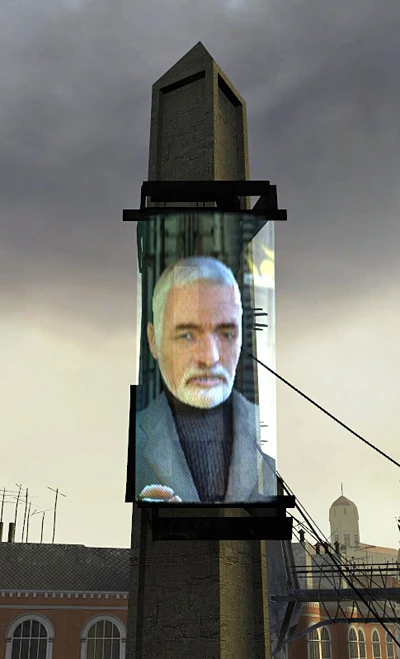 Dr. Breen uses video screens, like this one on the Trainstation Plaza, to talk to the Citizens of City 17, and in later stages of the game, directly to Gordon Freeman himself.